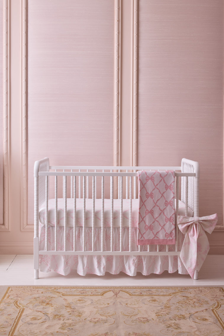 Our little loves’ cribs are extra cute with our new embroidered crib skirt featuring our iconic baby bow pattern.