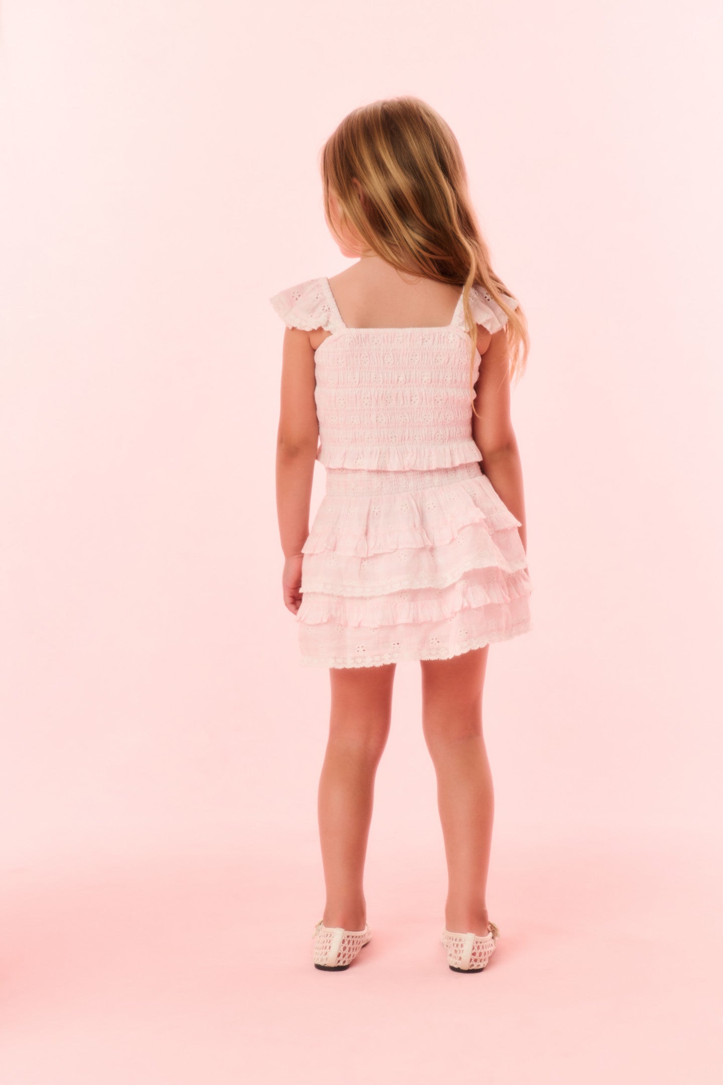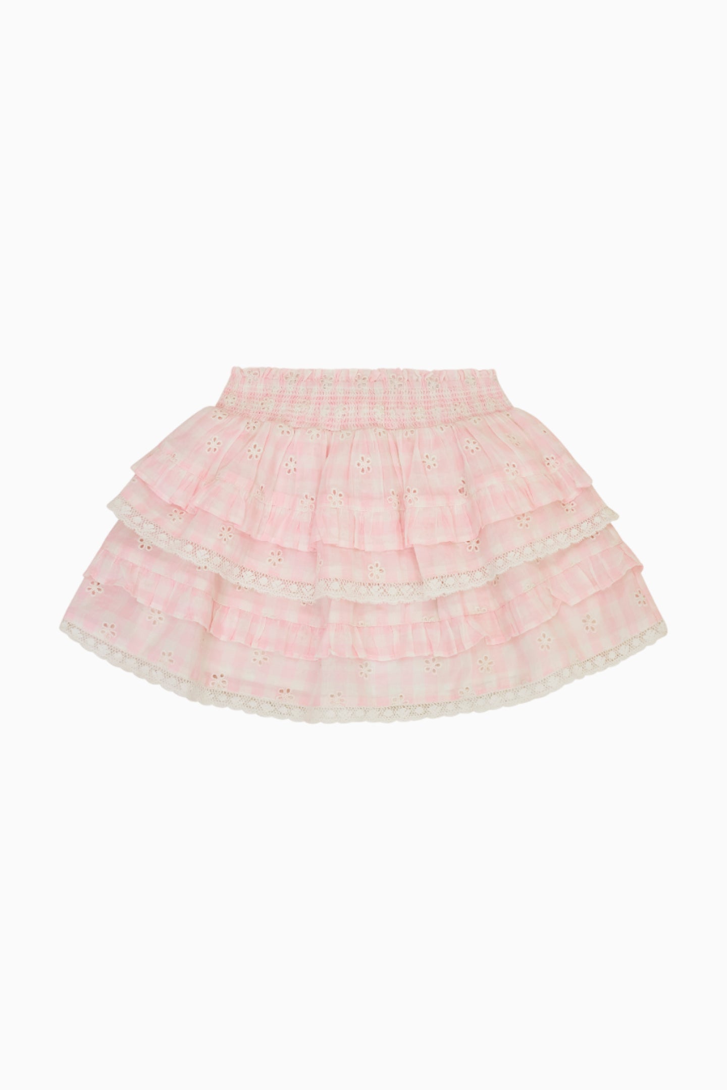 Meet our beloved Billie Skirt in 100% cotton. Below a wide smocked waistband, the skirt falls to two shirred tiers with ruffle details.