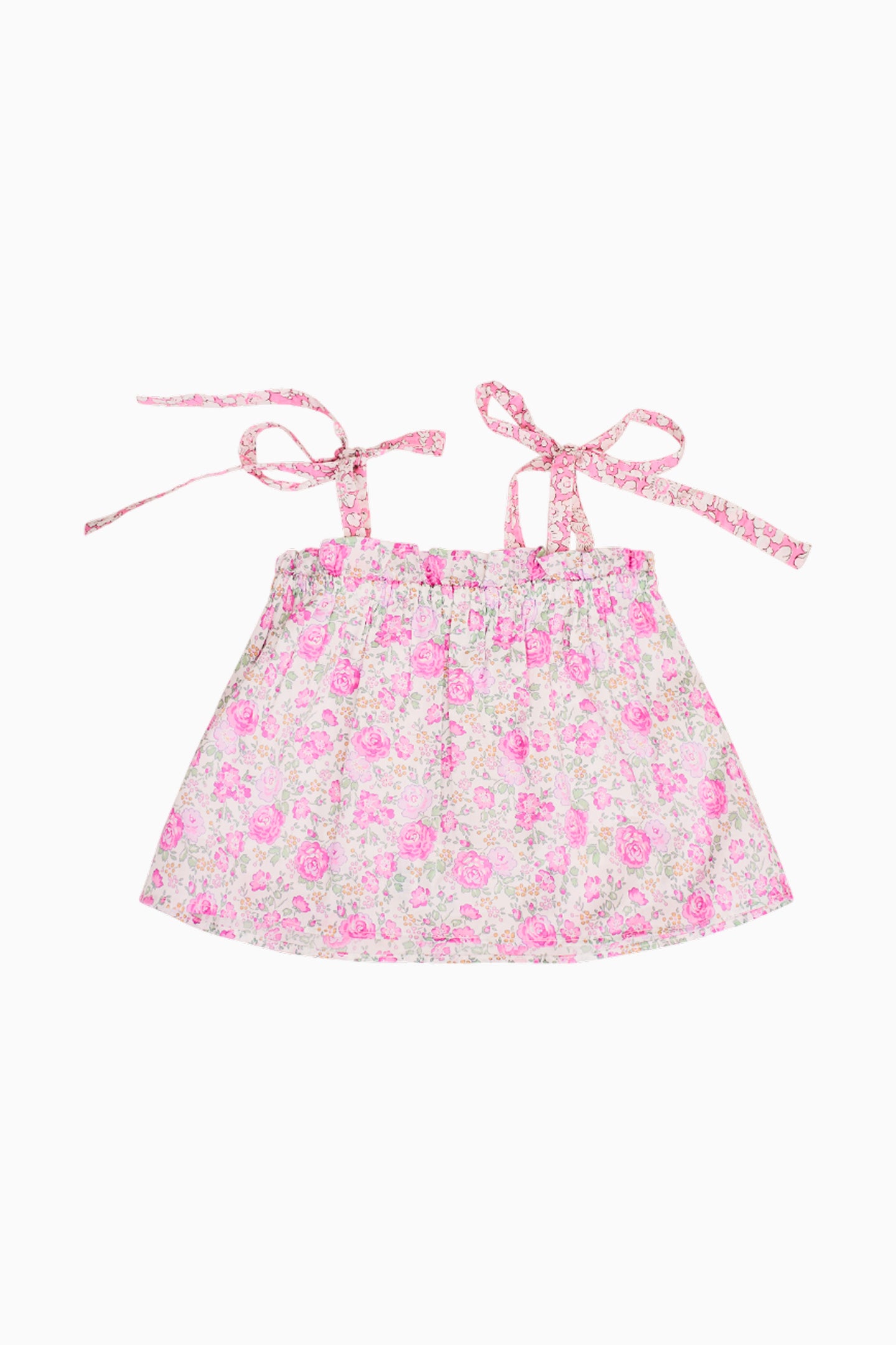 Introducing our latest capsule collection Made with Liberty Fabrics designed into our favorite elevated pieces.The Fiorella Top returns in Liberty’s Tana Lawn™ cotton fabric with a floral print all over. This pretty sunshine piece features thin straps with a bow detail, an eyelet neckline, a large bow embroidery, and a scalloped hem with eyelet detail.