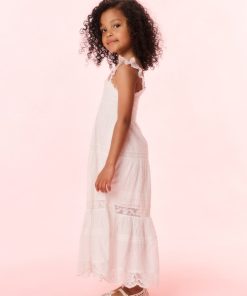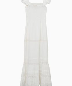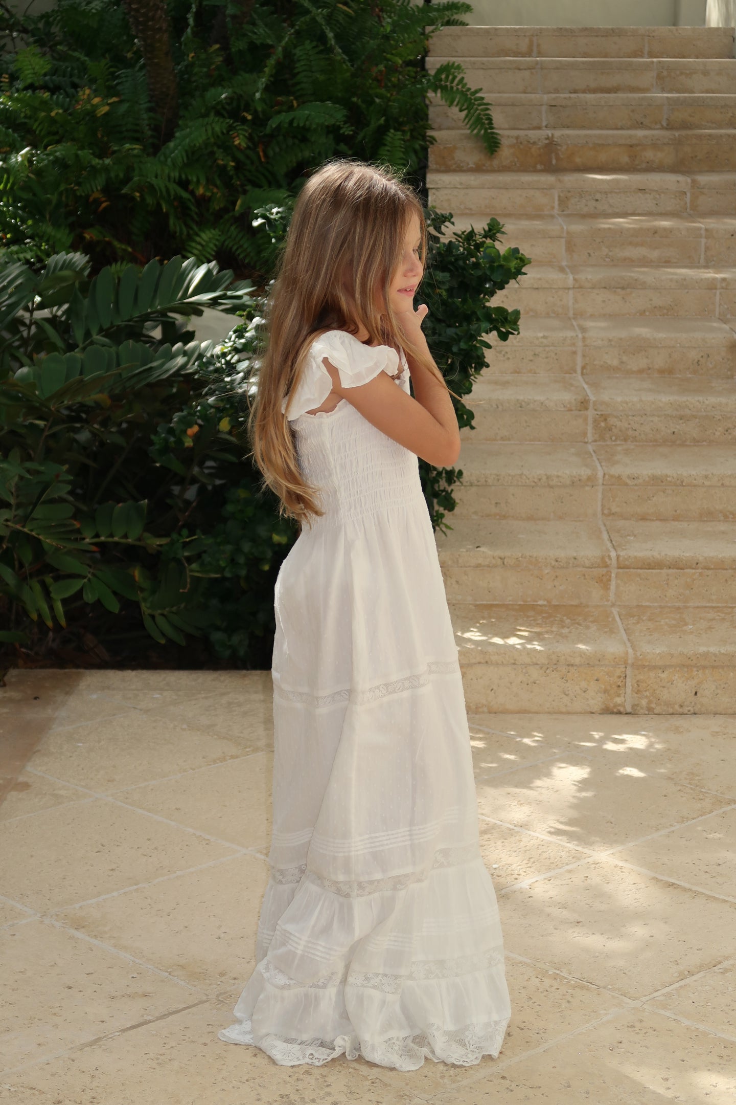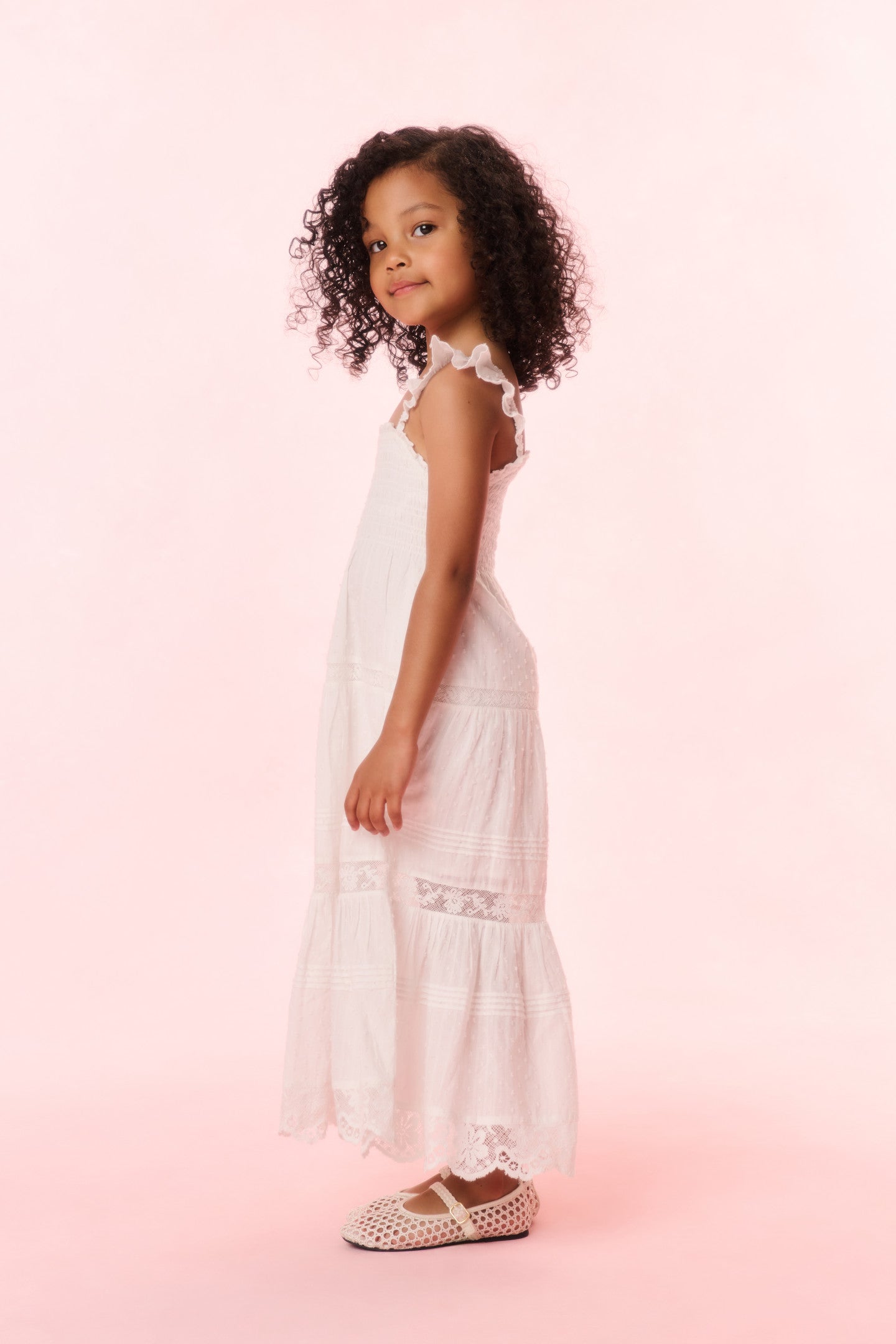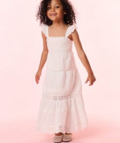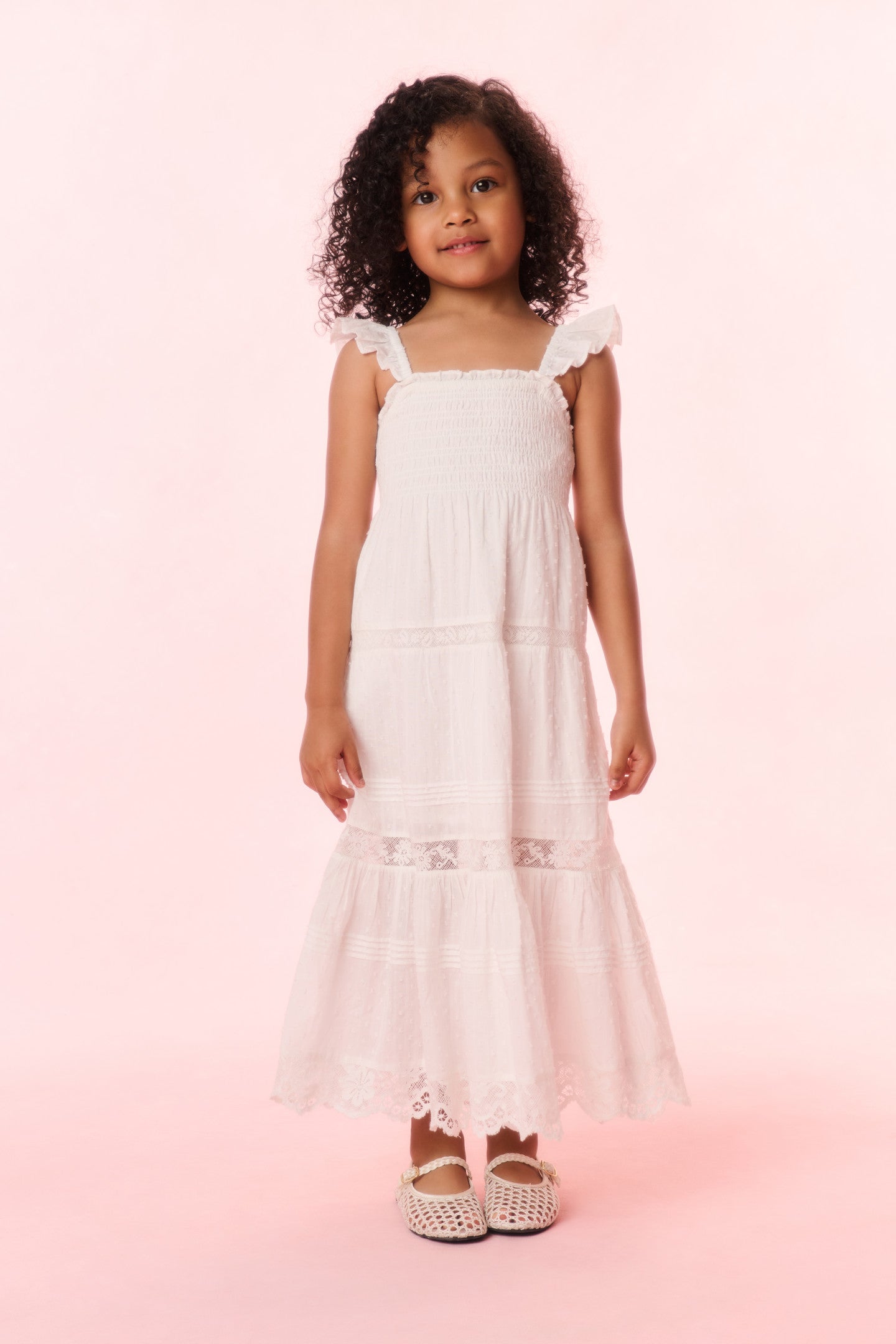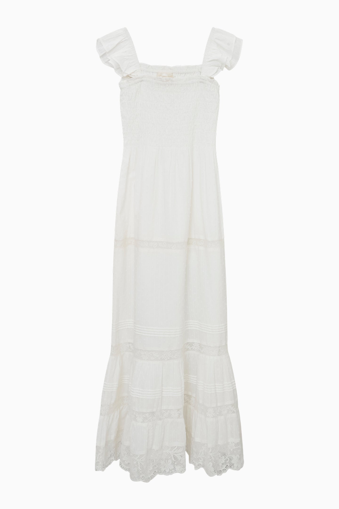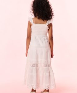 Introducing the Rhiannon Dress. This easy frock features tiny flutter sleeves, a square neckline, lace trims throughout, and an airy, flowy silhouette.