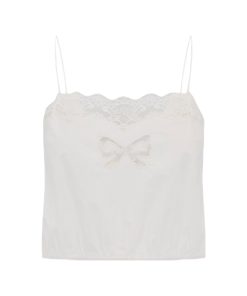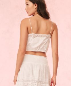 Classic and chic, our Aliaya Top arrives for spring. Designed from a crisp cotton poplin fabric, this ethereal crop top stuns with intricate, scalloped lace throughout and a sheer embroidered bow at center front. The top has thin spaghetti straps, elastic at the waist giving this piece a slight cinch for a flattering silhouette.