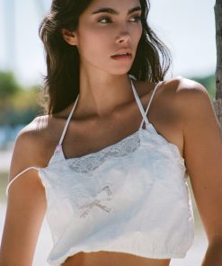 Classic and chic, our Aliaya Top arrives for spring. Designed from a crisp cotton poplin fabric, this ethereal crop top stuns with intricate, scalloped lace throughout and a sheer embroidered bow at center front. The top has thin spaghetti straps, elastic at the waist giving this piece a slight cinch for a flattering silhouette.