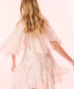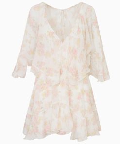 Introducing the Avaline Dress. This Bohemian-inspired piece debuts with a diaphanous chiffon fabric. The romantic mini features cape sleeves, a center back slit, ties at the neck opening and in the back for an elegant and feminine look.