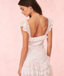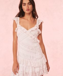Always the best dressed in the Bensley Dress. This charming mini is designed with an airy, cotton fabric with lace paneling all over. The fitted dress features arrangements throughout the body with pintucking and lace details. This piece is finished with ruffles at the shoulders, necklines and asymmetrical lace ruffles at the hem.