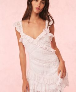 Always the best dressed in the Bensley Dress. This charming mini is designed with an airy, cotton fabric with lace paneling all over. The fitted dress features arrangements throughout the body with pintucking and lace details. This piece is finished with ruffles at the shoulders, necklines and asymmetrical lace ruffles at the hem.