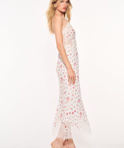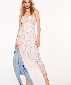 Feeling flirty in the Bristelle Dress. This cami slip dress debuts in a viscose chiffon fabric featuring spirited bouquet prints that have been inverted to an All-American red-and-white colorway. The midi has spaghetti straps and a twist draping detail at the bust that falls to a layer of chantilly lace at the bodice over the draped chiffon. With a bias cut, this dress is slinky and easy-to-wear. The dress is finished with chantilly lace at the hem.
