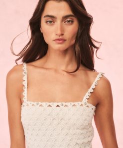 Effortlessly chic in the Camara Dress. This charming mini dress debuts with a lightweight, cotton fabric featuring heart-shaped lace. With a fit-to-flare silhouette, the A-line mod dress begins with thin grosgrain straps with rhinestone embellishments; the rhinestone embellishments continue around the neckline. This piece comes fully lined and has a side seam zipper.