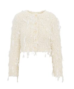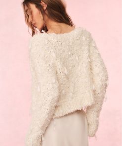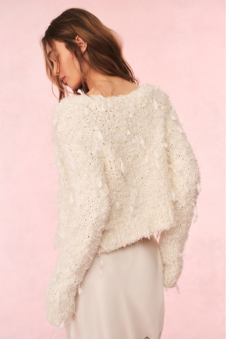 Feeling flirty and cozy in the Carol Cardigan. This dream knit debuts with stunning hand-dyed ribbons all over that have been hand-knit into a beautiful eyelash boucle yarn. The ribbons weave in and out of the fabric to create a playful, fringe effect. This must-have sweater is finished with our custom LoveShackFancy faux shell button with a bow motif.