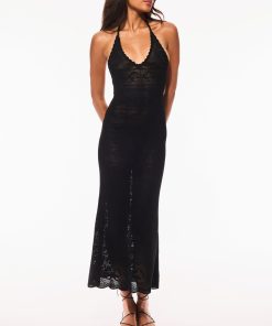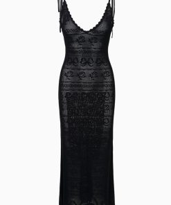 Introducing the Cillian Dress. This maxi dress features a pointelle jacquard knit fabric with a placed bow-and-rose pattern throughout. With a flattering and body-hugging silhouette, the straps feature self-tie details at the shoulder and arrives unlined.