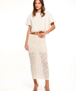 Introducing the Clooney Skirt. This stretch lace, midi skirt is effortlessly chic with scallop at the top edge and self start scallop at the bottom hem. The skirt comes with a lace lining featuring a scalloped edge. The waistband is elasticated making this piece easy to pull on.