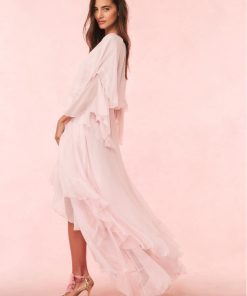 Introducing the Collia Dress. One of the hero pieces of our Spring 2025 runway show and our Founder and Creative Director, Rebecca’s, favorite, Collia Dress debuts with a diaphanous chiffon designed from 100% silk. The viscose, drapey chiffon gives this piece a Bohemian-inspired look and feel. This stunning event gown features a plunging, deep v-neckline with a cape around the shoulders, lovely boho-inspired bell sleeves, a multi-tiered skirt that goes high-to-low at the front then levels out around the hem. Delicate ruffles adorn each tier and the cape. A chiffon self tie detail sits at the back with an open slit. This piece comes fully lined and includes a side seam zipper.