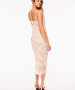 Seaside chic in the Harlette Dress. This gorgeous beachside-inspired midi debuts with a beaded mesh fabric featuring a stunning arrangement of shell-and-sequin embellishments all over. With a cami and fitted shape, the dress is finished with crochet lace at the neck and hemline. A zipper is included.