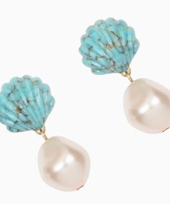 An unexpected finishing touch, the Nori Earrings find semi-precious turquoise formed by hand into scallop shells. Made by hand in New York, the stones are juxtaposed by a baroque-shaped crystal pearl drop. We love turquoise for the natural variations found in each stone, which means no two pairs are entirely alike.