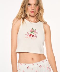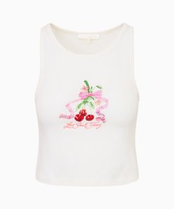 Introducing the Kaleen Tank as part of our America’s Sweetheart Cotton Collection. This flirty tank features a cherry graphic with LoveShackFancy on the front with tiny heart crystals for that extra shimmer. With a slim fit silhouette, this pretty piece a summer staple.