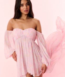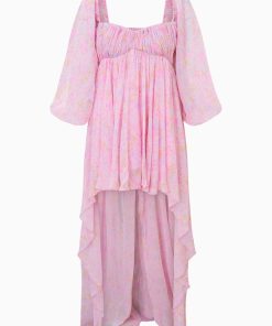 Florals forever in the Kataline Dress. This gorgeous gown arrives with crinkle textured chiffon fabric featuring an optimistic ditsy floral print all over. The high-to-low piece has elasticated, billowy sleeves that can be worn on or off the shoulders, an empire waist with shirring details on the cups for added texture, and structural boning on the interior for added support.