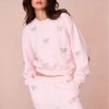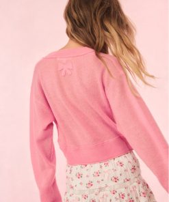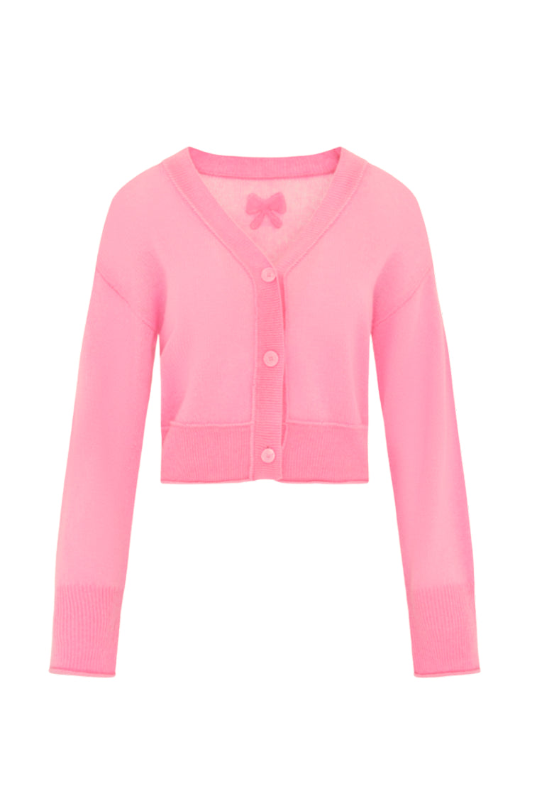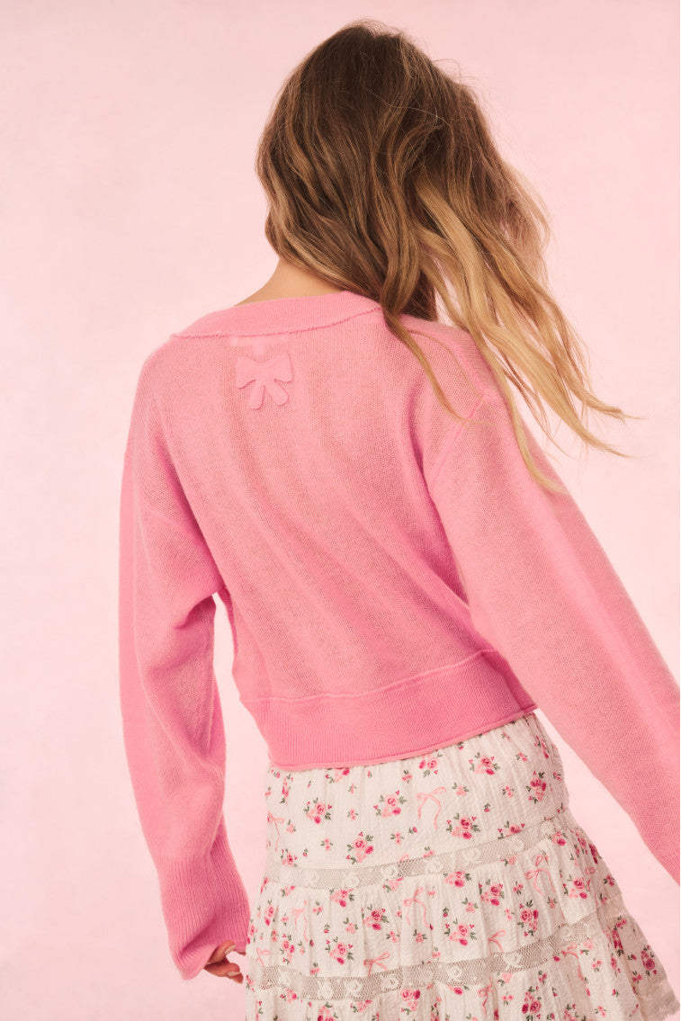 Loving on the Lawrence Cardigan. Designed from 100% cashmere, this knit arrives light and airy featuring charming ribbed details all over with tiny loops, a custom trim with a bow applique at the back of the neck, and our custom LoveShackFancy faux shell buttons etched with a bow down center front giving off a pearlescent effect.