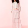 Nautical and coastal chic in the Lilibelle Dress. This warm weather mini arrives with a knit striped crochet fabric featuring crochet scallop trims throughout. The mini features a halter neckline with scallop details, a plackett down the front with crochet buttons, and loop straps made from a crochet chain halter. This piece is finished with a scallop detail at the hem. Pair with the Lamiya Cardigan for a matching layer.