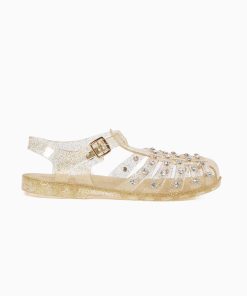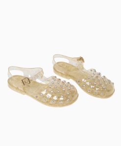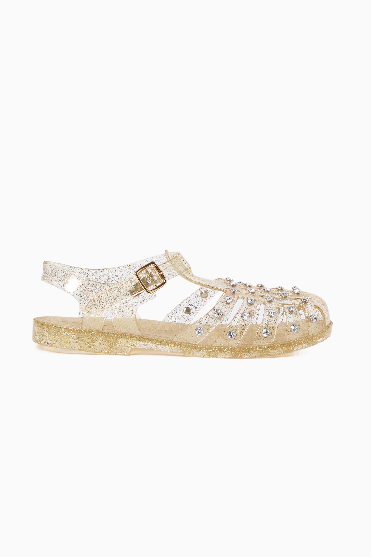 Flat caged sandal in champagne glitter jelly material with clear rhinestone embellishments. Features a buckle closure.