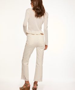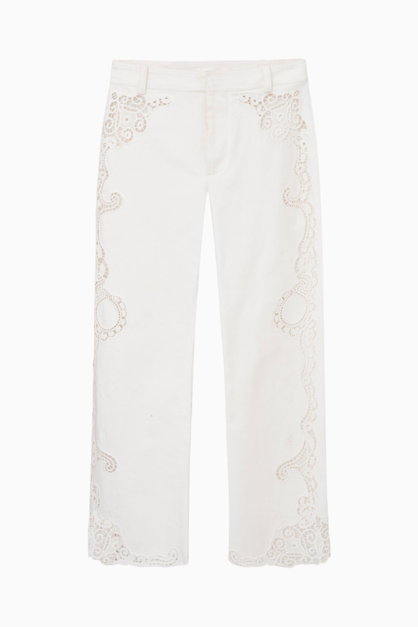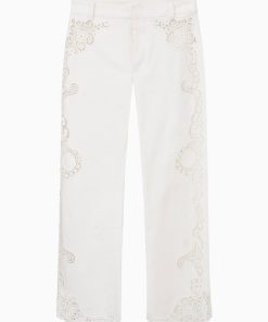 Elevated and sophisticated in the Maia Pant. Inspired by vintage textiles, these cropped bottoms debut with a medium rise length and stretch cotton fabric featuring doily lace inserts amongst beautifully arranged and tossed flower embroidery all over. The artisanal pants have patch pockets at the back and belt loops.