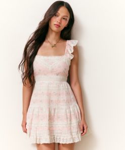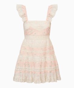 The Melitta Dress makes her dreamy debut designed from a cotton voile fabric with a pretty printed lace effect and intricate details like vintage-inspired laces stripped throughout. This Victorian-inspired piece begins with flutter sleeves, a straight neckline with chevron lace detailing at the bust, a sweet tiered skirt, and smocking at the back for ease and comfort.