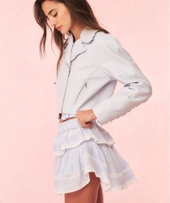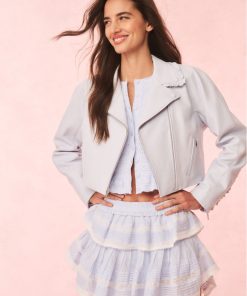 Level up your look with the Rheisa Jacket. This 80s-inspired moto jacket is designed from 100% lamb leather. The piece begins with a biker collar and princess zip up seam around the collar with delicate ruffles to give it our signature feminine touch. The ruffles flow to the back and travel up the back of the sleeves and around the jacket. With a modern look and feel, this piece is finished with two zipper pockets with leather zipper pulls.