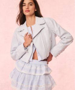 Level up your look with the Rheisa Jacket. This 80s-inspired moto jacket is designed from 100% lamb leather. The piece begins with a biker collar and princess zip up seam around the collar with delicate ruffles to give it our signature feminine touch. The ruffles flow to the back and travel up the back of the sleeves and around the jacket. With a modern look and feel, this piece is finished with two zipper pockets with leather zipper pulls.