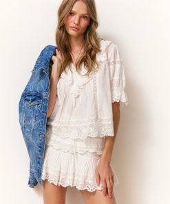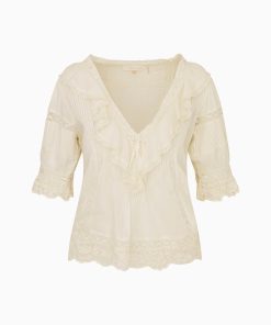 Romance found in the Romilly Blouse. Designed from a cotton voile fabric, this Victorian-inspired top features lace trims and delicate pintucks all over, a threaded ribbon around the v-neckline, and feminine puff sleeves.