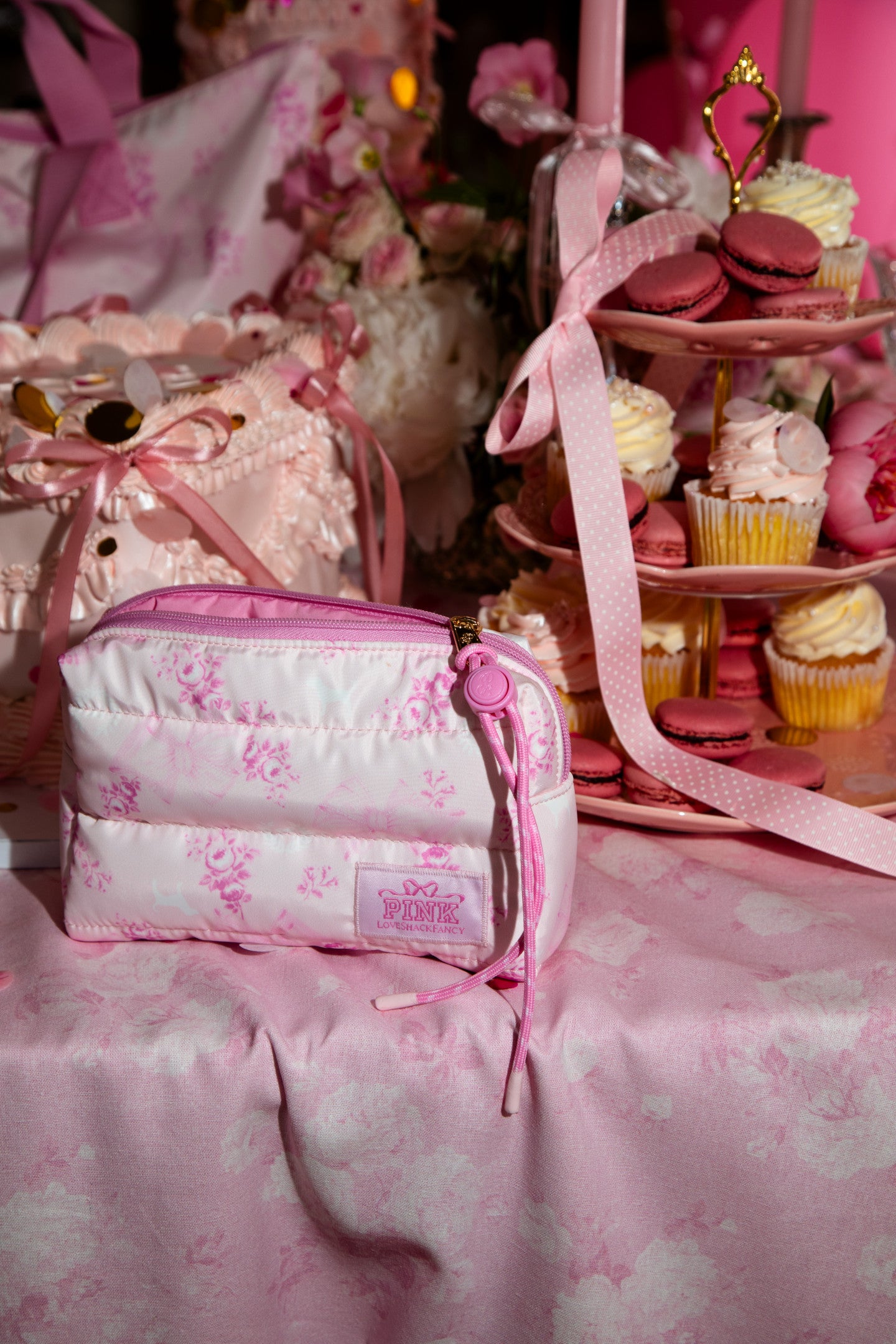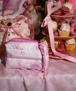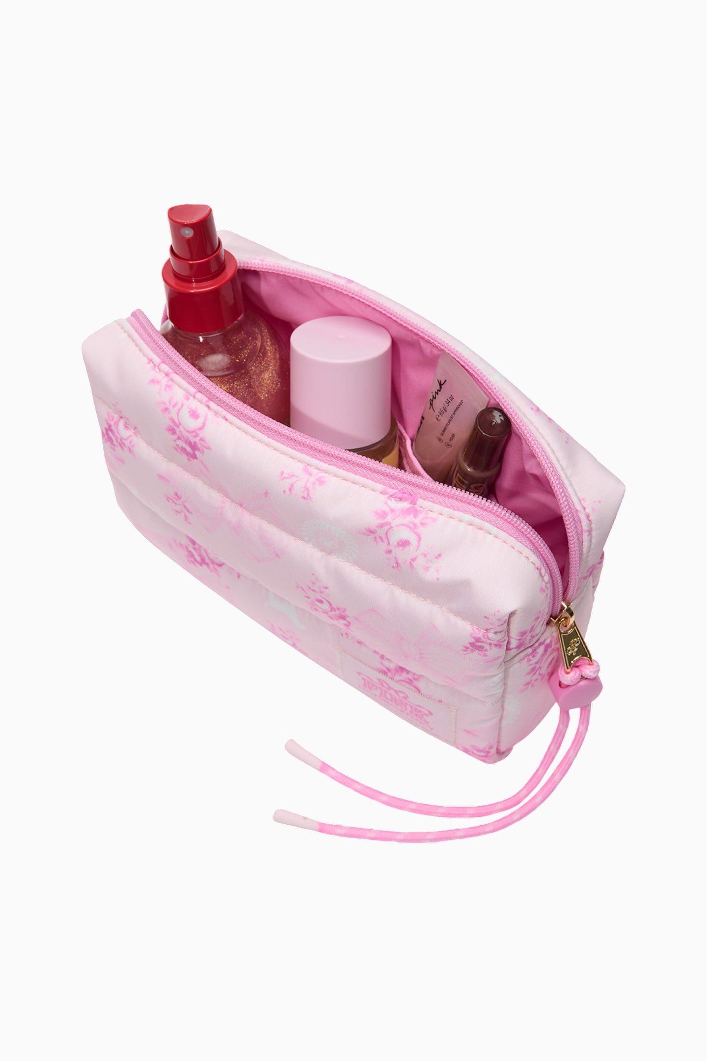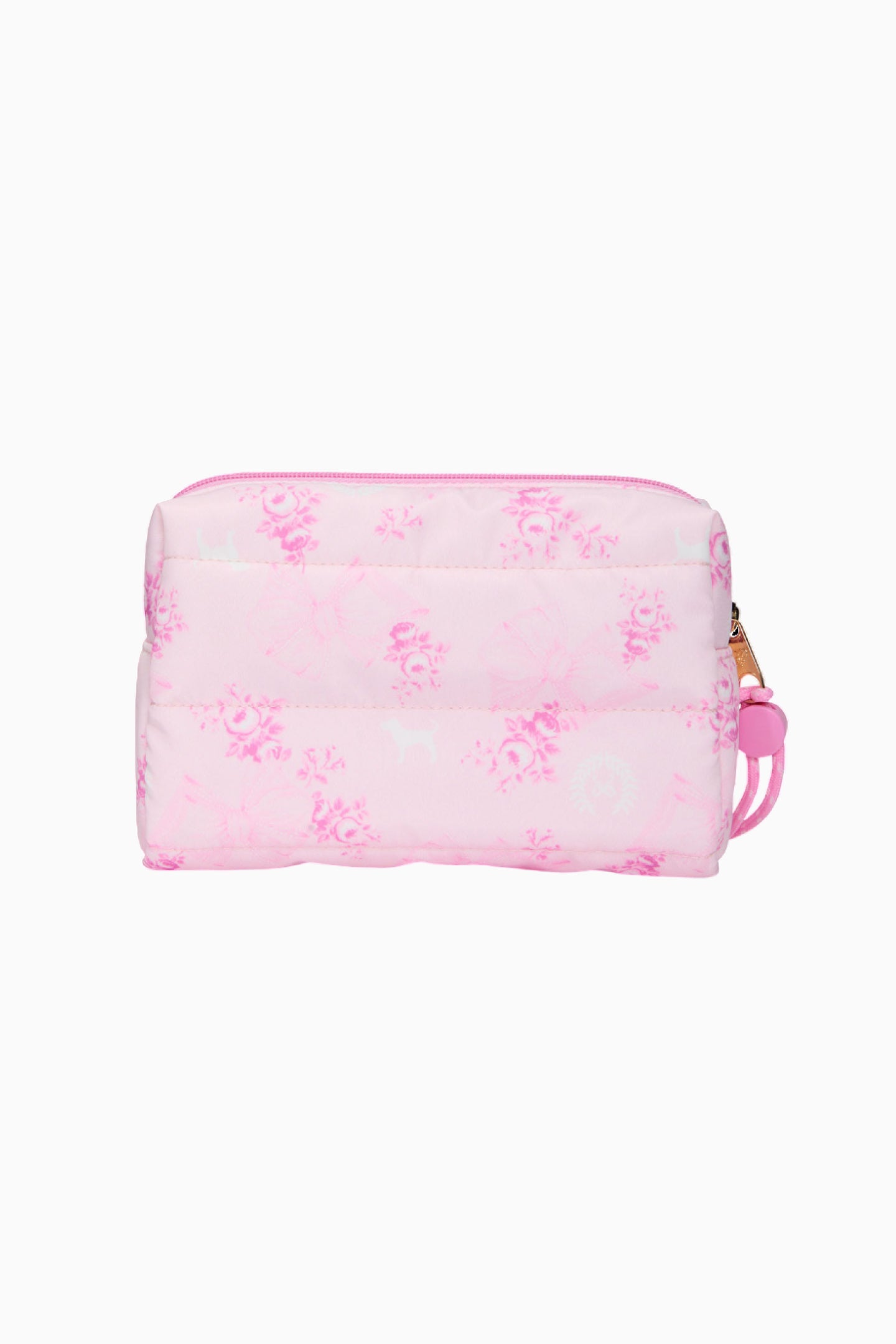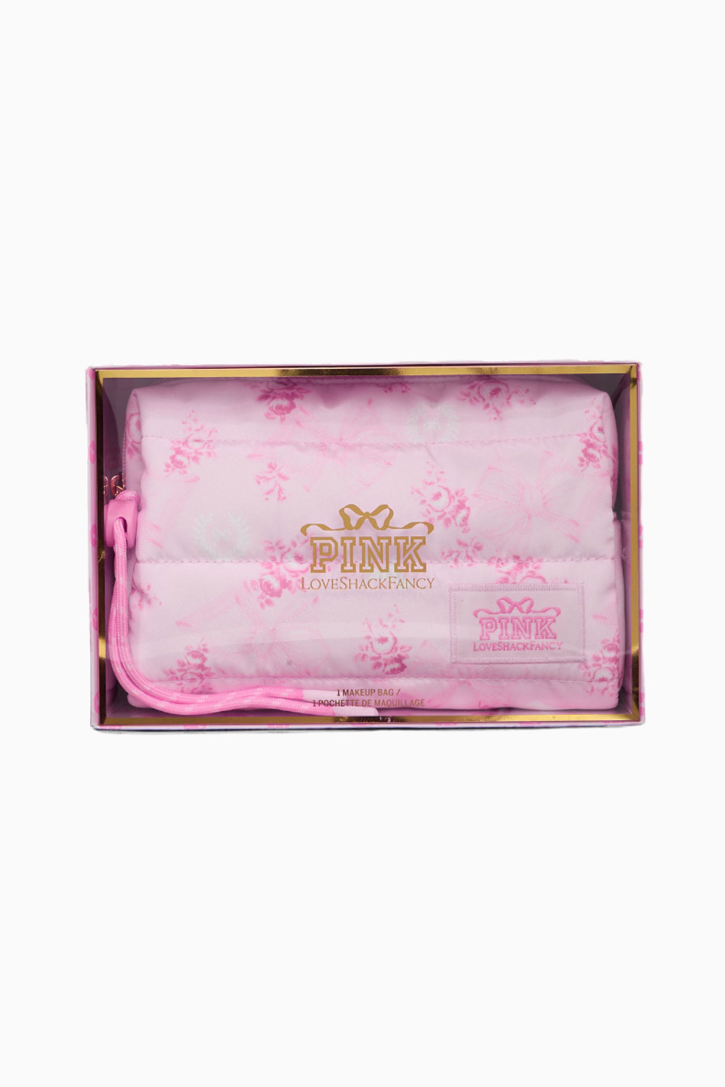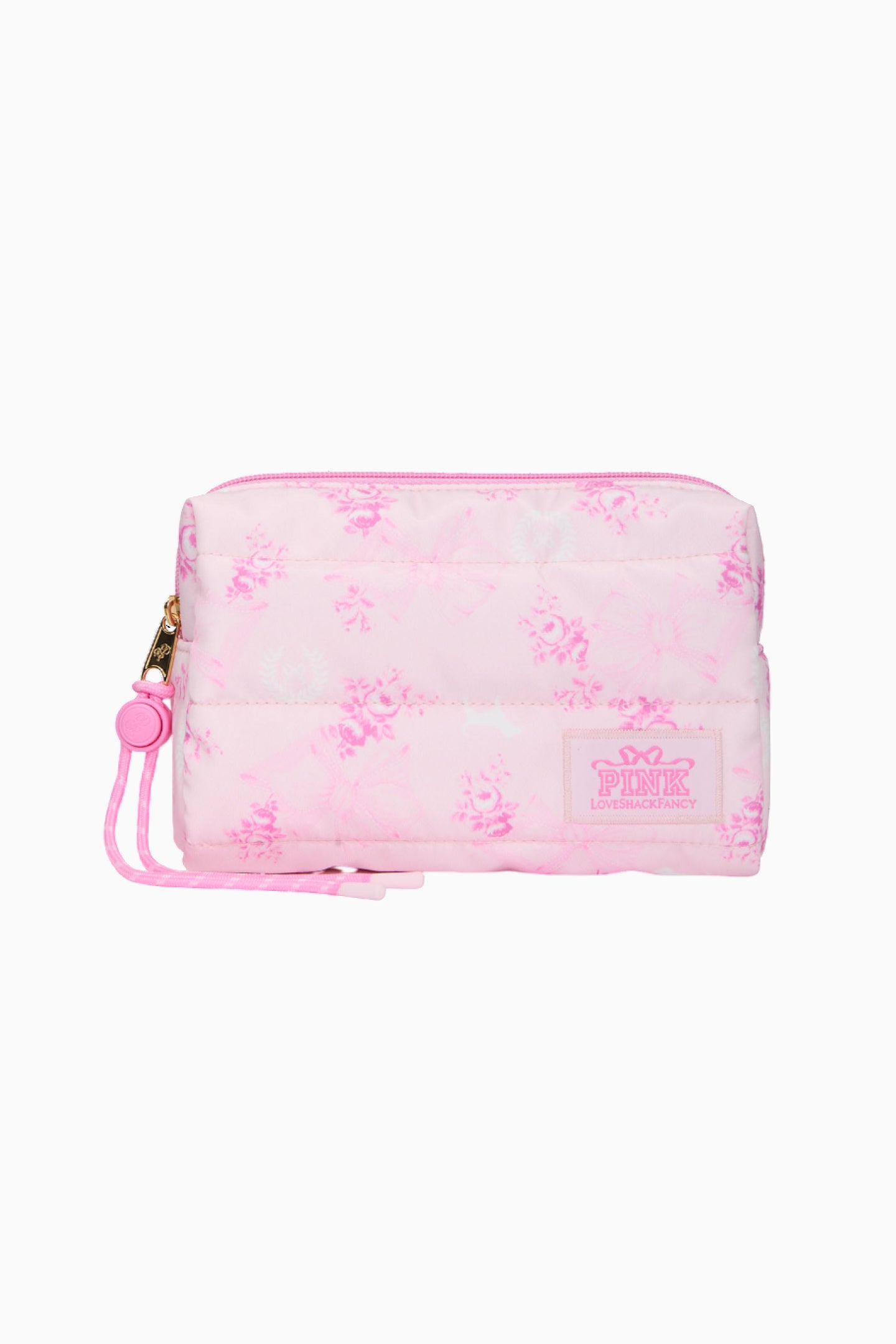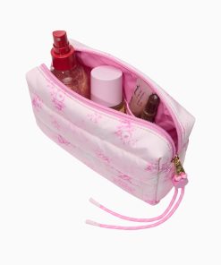 Introducing the Makeup Bag from the exclusive, limited-edition PINK x LoveShackFancy collaboration. Your GRWM just got fancier. This quilted cutie features a paracord detail, interior pockets, and a sweet, printed pattern that makes storing all your stuff a total dream.